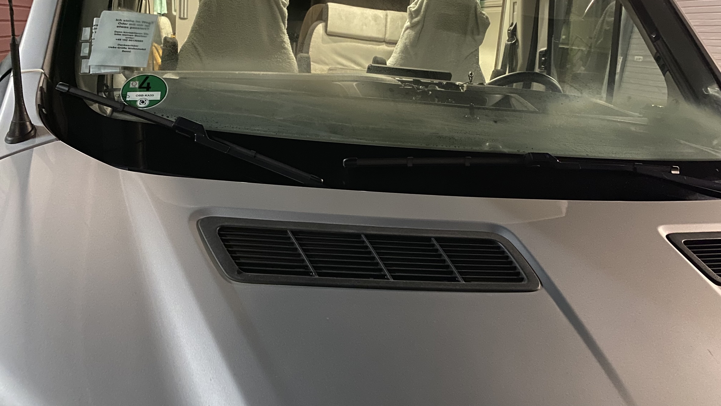 Durch die großen Wassermassen vom Dach des Wohnmobils läuft die „Regenrinne“ im Bereich der Scheibenwischer über und das Wasser läuft in den Motorraum. Rechts und Links an der Rinne sind jeweils 2 Abläufe. Auch hier kann Wasser überlaufen und in den Motorraum gelangen. Gerade wenn diese kleinen Löcher verstopft sind.